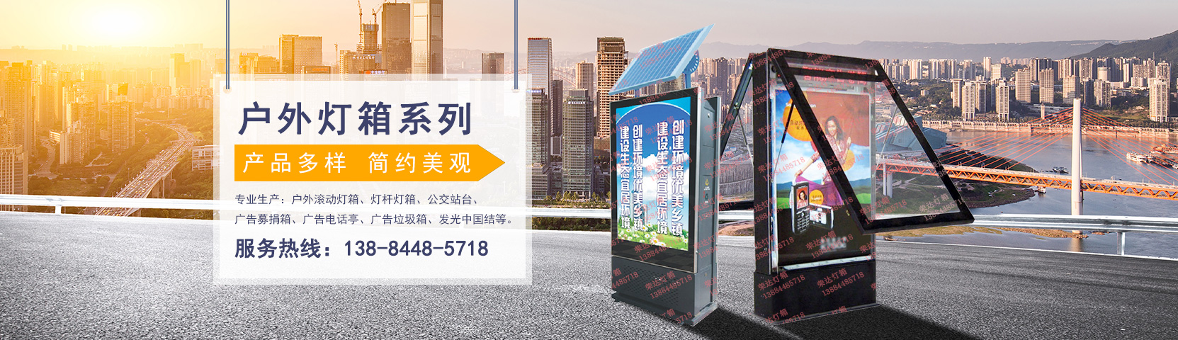 燈桿燈箱 中國結&燈籠 戶外廣告燈箱 指路牌燈箱 電話亭燈箱 廣告宣傳欄 ATM防護罩 廣告募捐箱 公交站臺 廣告垃圾箱 廣告擦鞋機 室內廣告燈箱